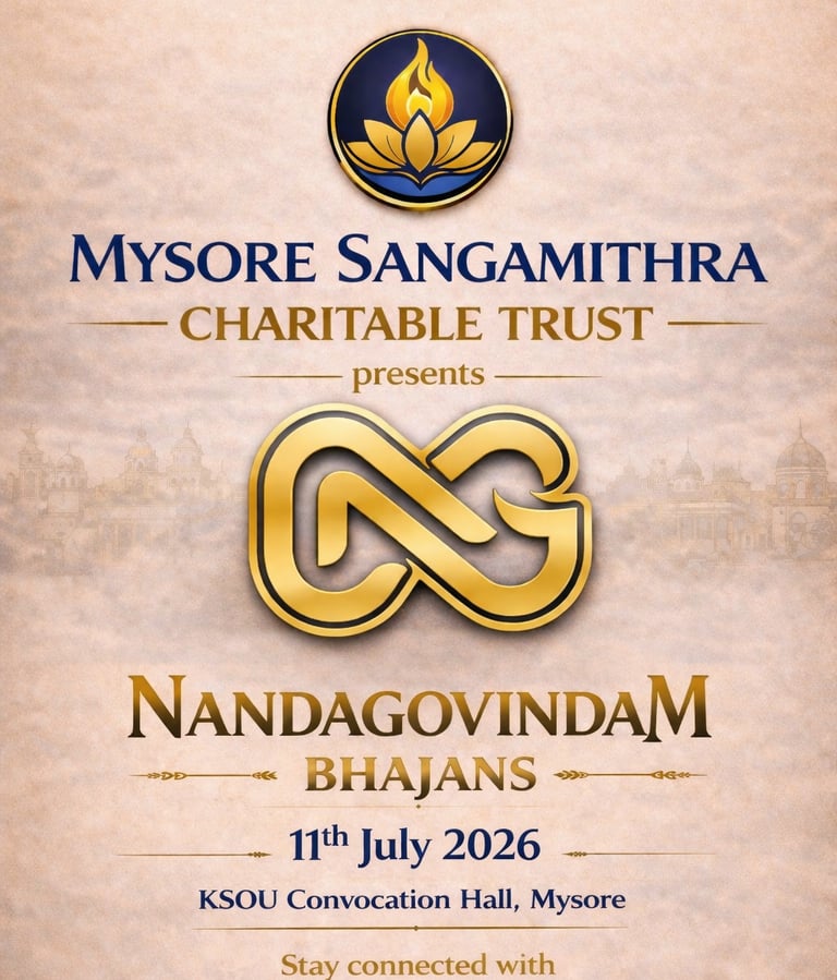 A soulful devotional program featuring “Nandagovindam Bhajans", scheduled on 11th July 2026 at KSOU Convocation Hall, Mysore. The event aims to promote cultural values and bring the community together through music and devotion.